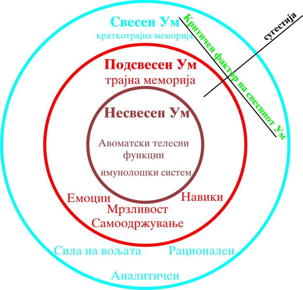За полесно разбирање на Хипнозата ќе речеме дека во нашата глава имаме три ума, Свесен, Подсвесен, и Несвесен, и секој од овие три ума има своја функција :